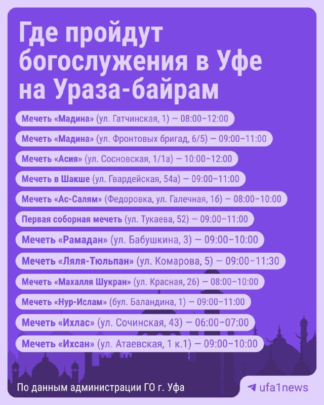 🌙 Богослужения на Ураза-байрам пройдут в Уфе в 23 мечетях.В понедельник на площади перед ТЦ «Башкирия» будет праздничная программа: концерт,