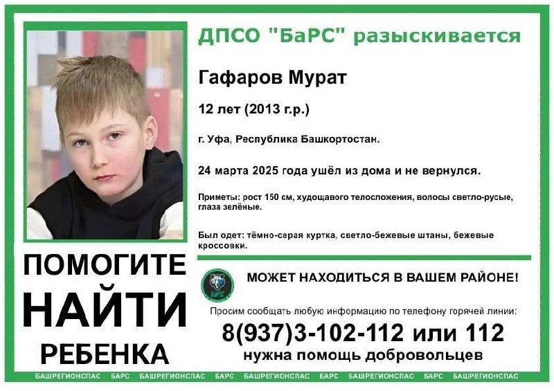 В Уфе завершились поиски 11-летнего Мурата Гафарова По сведениям волонтеров, мальчик найден живым и здоровым. Подробностей нетufa2. Подписаться | Прислать