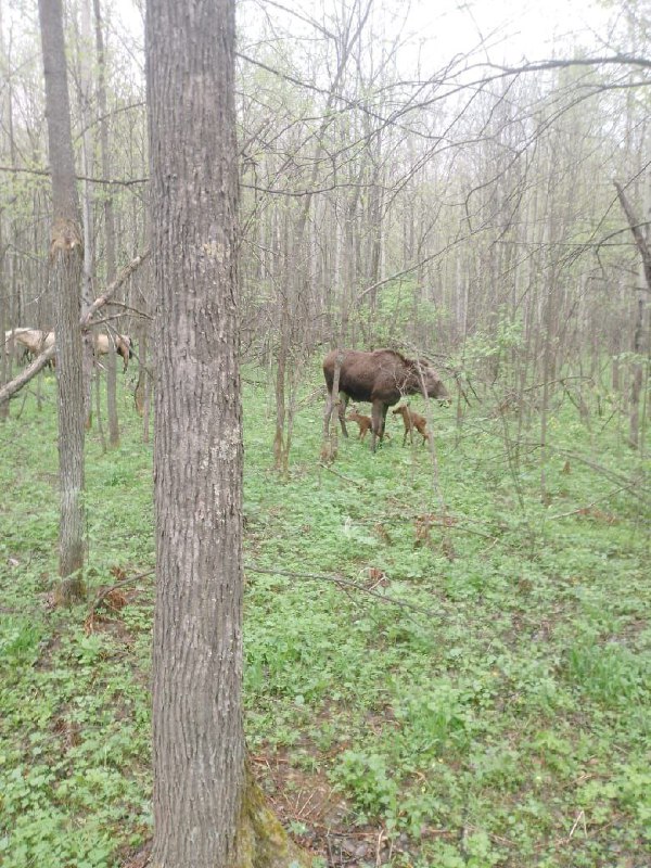 Инспектор природного парка «Зилим» сделал редкий кадр — лосиха с двумя новорождёнными малышами гуляла по лесу. Новорожденные малыши уверенно встали