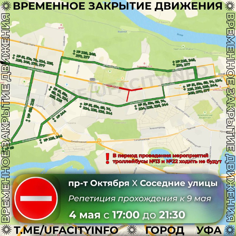 Внимание: в Уфе сегодня из-за генеральной репетиции парада Победы перекроют проспект ОктябряОграничения движения введут с 17:00 до 21:30. В этот