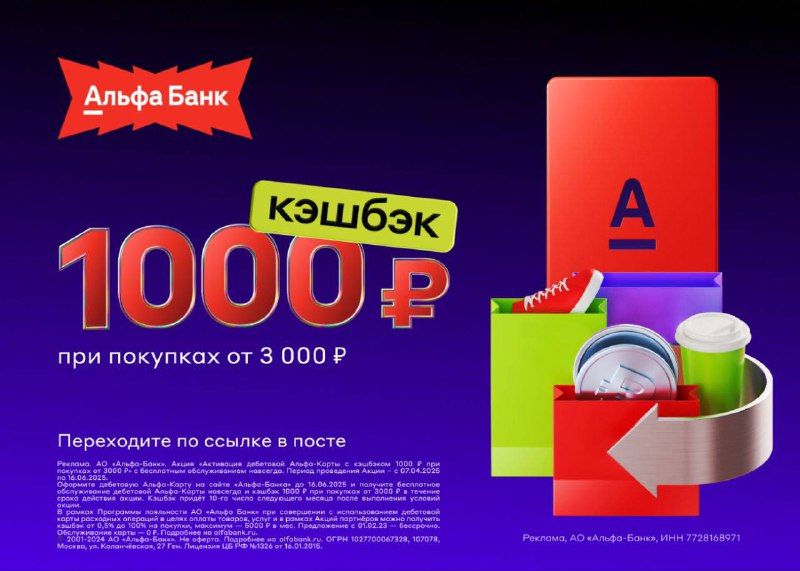 ⚡️ Как получить кэшбэк 1000 ₽?Оформляйте дебетовую карту от Альфа-Банка и получите бонус!🎁 Кэшбэк 1000 ₽ при покупках на сумму
