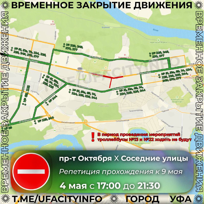 ⛔️⛔️⛔️⛔️⛔️ Перекрытие дорог: проспект Октября и соседние улицы4 и 7 мая в Уфе проведут генеральные репетиции торжественного прохождения военнослужащих, ветеранов,