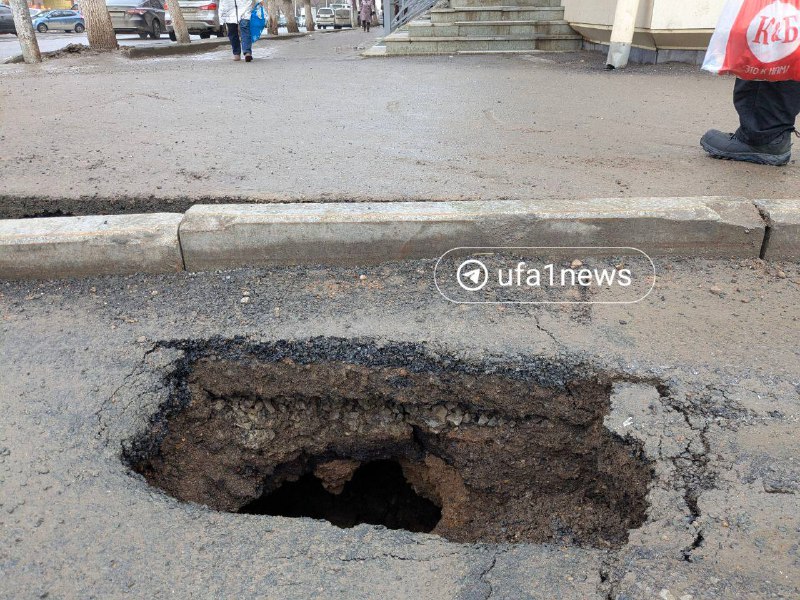 И еще один провал в Уфе. Асфальт обвалился на перекрестке Ленина и бульвара Ибрагимова Яма образовалась на месте, где на