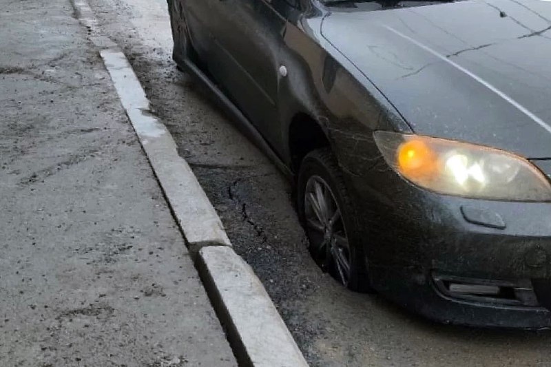 Два автомобиля угодили в яму на ИбрагимоваВ Уфе в одной и той же яме на перекрестке бульвара Ибрагимова и ул.